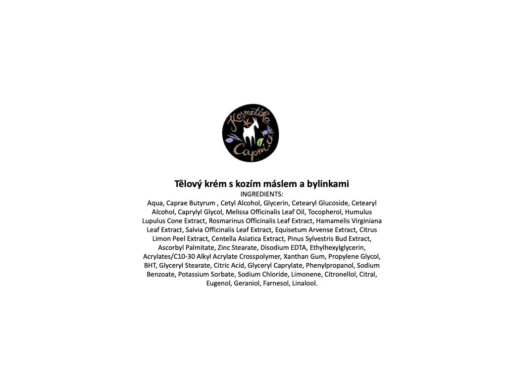Obsahuje: kozí máslo, bylinné extrakty z rozmarýnu, chmelu, šalvěje, vilínu, přesličky, borovice, pupečníku a citronu, zinek a vitamin E.